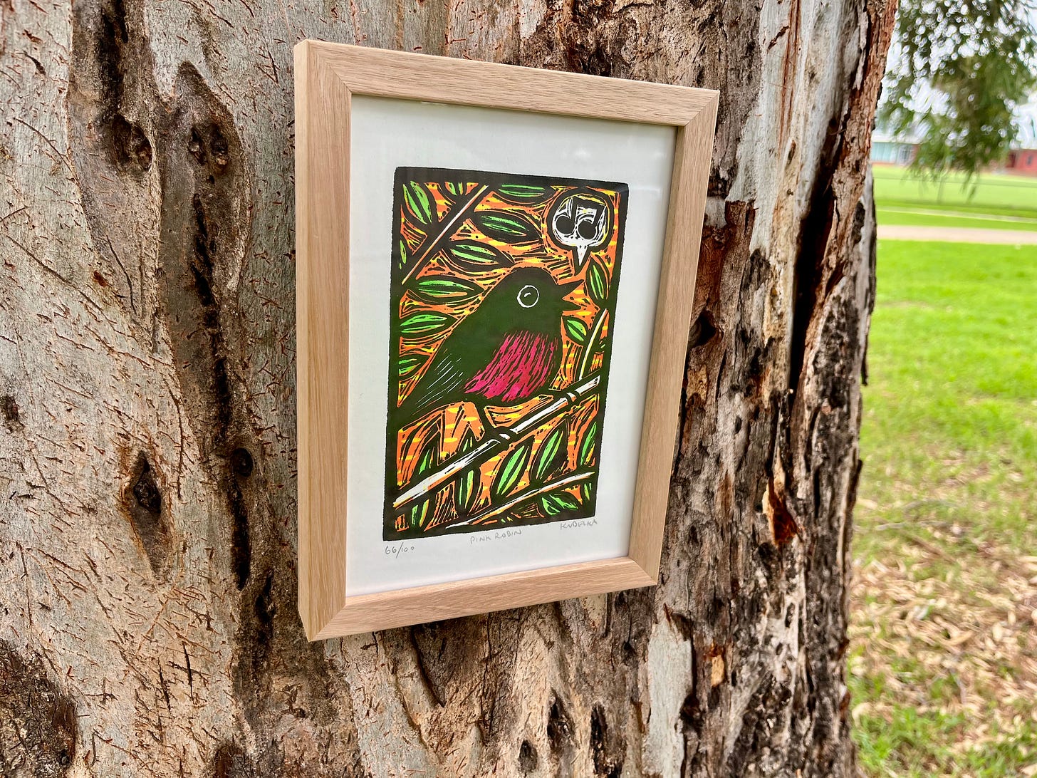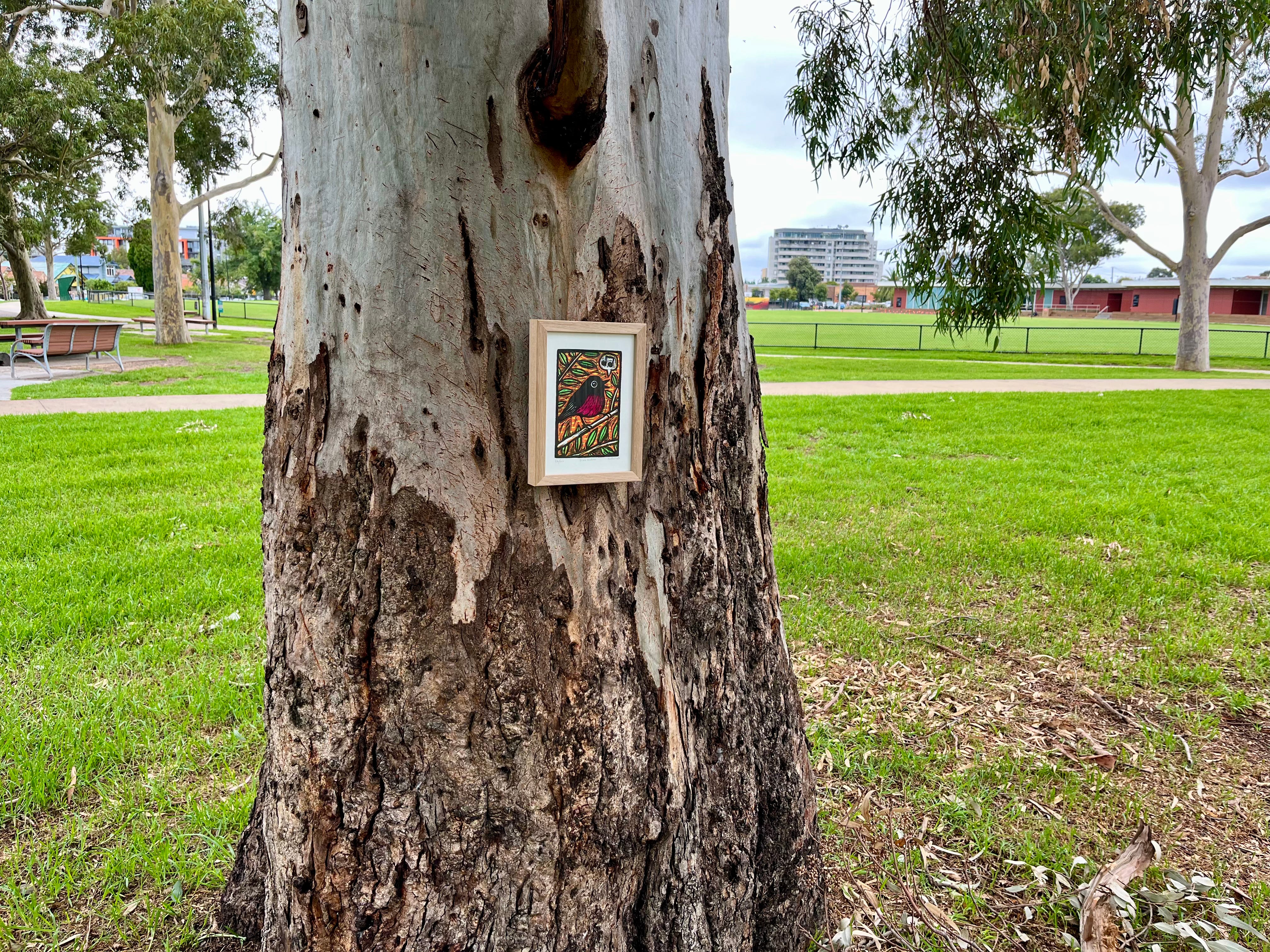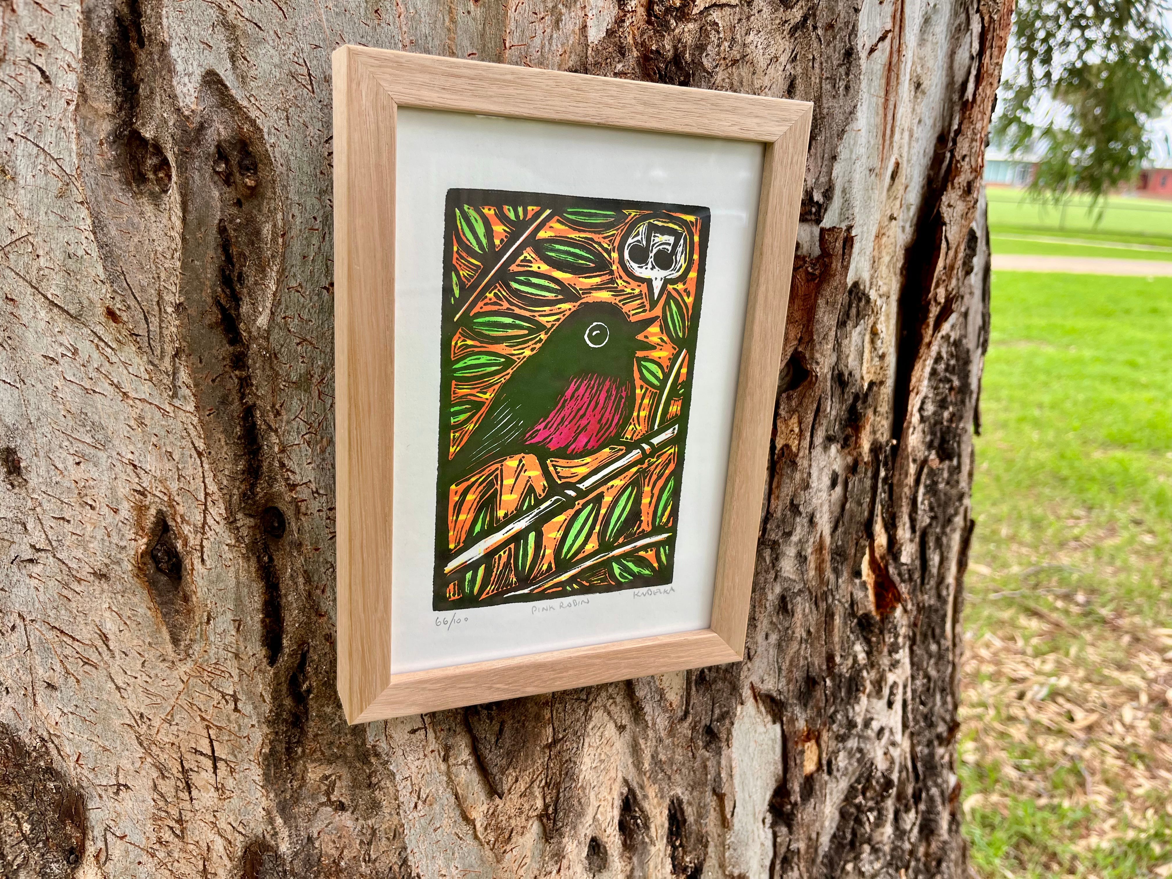 During the past week the pink robin arrives from Hobart. I frame the image at a local framing store and on the way home, take some photos in a local park to share with Maggie back in Hobart.